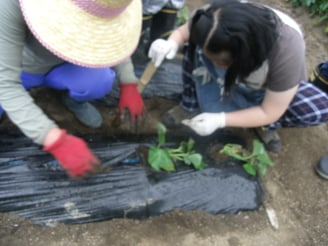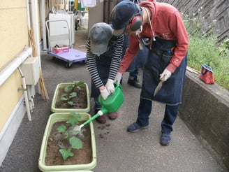 今年で3年目になります。夏野菜の苗植えの時期がやってきました。昨年・一昨年と同様、4月23日にブーケの皆でナス・キュウリ・トマトの苗を植えました。一昨年は豊作でとても美味しい夏野菜を毎日頂けたのですが、昨年は猛暑のせいか、収穫量が増えず少し残念な思いをしました。しかし、「あの美味しい夏野菜の味をまた味わいたい!」と、今年もジョイ・ジョイ・ワーク引野の運転手の野毛さんに指導してもらいながらワイワイと楽しく苗植えをしました。今から収穫の時期が楽しみです。