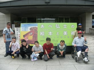 ブーケでは、鞆の津ミュージアムで『どや、○○じゃろ展!』に行きました。これは障害者の方々の絵や作品を展示していました。画用紙いっぱいにハンコを貼っていたり、動物や車の絵、木の枝で作ったイノシシの模型など、感性豊かな作品が展示されていました。みんな「これは猿だね」「色が多くてきれい」など、見入っていました。ブーケのみんなも素晴らしい絵を描くので、個展を開きたいなと職員は思いました。