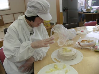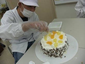 4月22日 ふらわあ・ブーケのそれぞれでお誕生日会を開催しました。ふらわあでは1人、ブーケでは2人のお誕生日をお祝いしました。お祝いをする前にみんなでケーキ作りをしました。ホイップクリームを混ぜたり、きれいに盛り付けをしたり、みんなで力を合わせておいしいケーキを作ることができました。部屋の中は甘い香りでいっぱいで完成する前から食べるのが待ち遠しかったです。お楽しみのケーキを食べる時間になり、みんなで「ハッピーバースデー」を歌いました。残念ながらふらわあのお誕生日の主役はお休みでしたが、おうちに届くくらい大きな声で歌いました。ブーケでも2人の利用者さんの誕生日を盛大に祝いました。来月のお誕生日会はどんなお誕生日会になるのか楽しみですね。