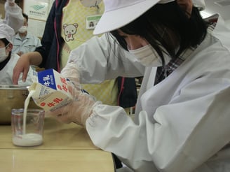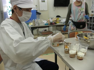 7月のおやつ作りは、暑い時期にぴったりの逸品をふらわあ、ブーケそれぞれで作りました。ふらわあでは、杏仁豆腐を作りました。杏仁豆腐の元となる杏仁霜や牛乳をボールに入れて、利用者様みんなで丁寧にかき混ぜました。容器に均等になるように流し込み、冷やして完成!口の中に甘みが広がって、ほっぺがとろけ落ちそうでした。