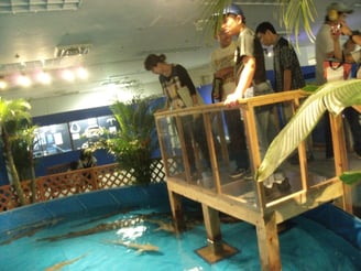 ふらわあ・ブーケの8月のお出かけは、天満屋水族館・ブルーベリー狩りに行ってきました。天満屋水族館はナンバーワンの生き物展ということで、大きなカニやきれいなクラゲ、なかなか見ることができないサメや大きなウミガメなど、とにかくたくさんの生き物を見ました。目玉といえば、よちよち歩くペンギンはとてもかわいかったですね。他にも、ナマコやヒトデ(本物です)に触れるコーナーもあり、ムニムニとした感触が病みつきになりました。笑