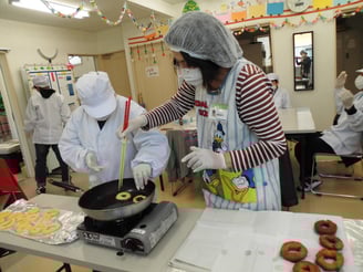 4月のお菓子作りでは、ふらわあはチョコチップマフィン、ブーケはドーナツを作りました。ふらわあでは、小麦粉や佐藤などをボールに入れ、みんなで交代しながら一生懸命かき混ぜていました。手が疲れる作業も笑顔で取り組んでいました。また、牛乳をどれくらい使うかなど慎重に量っていました。職員が焼き、最後に砂糖などをトッピングし完成!みんなで美味しく食べていました。ブーケでは、生地をかき混ぜて、自分たちでドーナツの形になるように、丁寧に形作りを行っていました。綺麗な円形のドーナツが完成し、みんな幸せいっぱいな顔で食べていました。お菓子作りの終わった部屋はお菓子のいい匂いとみんなの笑顔で溢れていました。