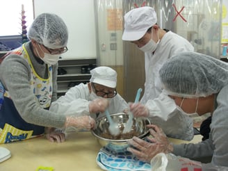 ふらわあは5月におやつ作りということで、「プリンアラモード」を作りました。先月に作った「チョコチップマフィン」に比べると、工程も少なかったですが、楽しくできました。今回はプッチンプリンの「プッチン」がとても楽しみだったようで、皆さんはプリンの周りに集まって順番を待ちながら、楽しくプッチンすることができました。今回はホイップクリームに砂糖を入れなかったため、大人な味でしたが、フルーツの甘みもあって、とてもおいしかったです。ブーケでは「ボールクッキー」作りました。毎月の楽しみであるおやつ作りでは本当に盛り上がって楽しいです。来月も楽しみですね。