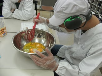 ブーケではパンプキンケーキを作りました。同様にかぼちゃを加熱させ、卵や薄力粉・生クリームなどを入れてハンドミキサーで勢いよく混ぜました。器に入れてケーキが焼き上がるのを待ちました。完成したケーキはふわふわで美味しかったです!