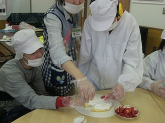 5月23日 ふらわあでお誕生日会を開催しました。ふらわあでは1人のお誕生日をお祝いしました。お祝いをする前にみんなでケーキ作りをしました。今月はイチゴのショートケーキを作りました。イチゴなどの材料のお買い物からきれいに盛り付けをして食べるまでがとても楽しかったです部屋の中は甘い香りでいっぱいで完成する前から食べるのが待ち遠しかったです。お楽しみのケーキを食べる時間になり、みんなで「ハッピーバースデー」を歌いました。ふらわあのお誕生日の主役のために大きな声で歌い誕生日を盛大に祝いました。来月のお誕生日会はどんなお誕生日会になるのか楽しみですね。
