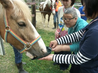 5月21日 ブーケは福山少年自然の家に行きました。みんなで仲良くご飯を食べた後、体育館でカローリングを行いました。カローリングとは室内型のカーリングで、ポイントゾーンに向かってジェットローラーという丸い円盤を投げます。高得点を出すためにどこに投げればいいのか意見を出し合いながら行っており、たくさん遊び楽しむことができました。ふらわあでは、5月20日ホースクラブと美術館に行きました。ホースクラブでは、馬に触ったり餌をあげるだけではなく、実際に乗馬をしたりと、普段関わることのできない馬と身近に触れ合い、みんなの笑顔をたくさん見ることができました。美術館では、絵本作家のあべ弘士さんのかわいらしい動物の絵を鑑賞し、なんの動物か当てながら鑑賞し、楽しめました。