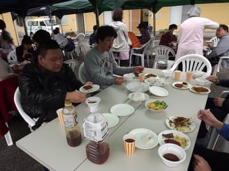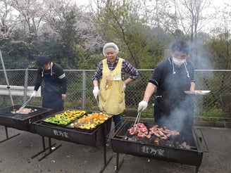 ウグイスの声が日ごとに増してきた4月8日にジョイ・ジョイ・ワーク引野にてお花見・バーベキューを行いました。新年度一発目の毎年恒例の行事だけあり、これまではいつも晴天の中で開かれていたのですが、朝から雲行きが怪しい感じ。雨も小降りでしたがぽつぽつと降り始め、テントを一面に張って準備完了。雨の代わりと言ったらなんですが、この時期は葉桜になる時期ですが、今年はほぼ満開といってもおかしくないほどの桜が堪能できました。メインのバーベキューはジャンジャン肉が焼かれ、ほぼバイキングの様な食べ放題状態で満喫されたのではないでしょうか。