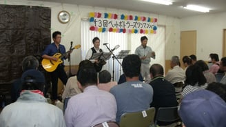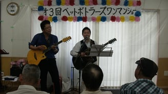日中は汗ばむ季節を迎えた、5月13日にジョイ・ジョイ・ワーク引野にて東林館高校の喜田先生が率いるその名も『ぺっとぼとらーず』の二人組によるワンマンショーが行われました。コブクロの『蕾』や松山千春の『恋』などバラード曲やアリスの『チャンピオン』やSMAPの『夜空ノムコウ』などのリクエストにも何曲か応えてくれました。最後に恒例の『勇気100%』を皆で大合唱した後、本来はアンコールはなしの予定でしたが、急きょ尾崎豊の『僕が僕であるために』を歌っていただきました。その歌詞の中にある「正しいものは何なのか それがこの胸に解るまで」のフレーズになぜか心打たれました。コンサート自体はこれで3度目を迎え、これまでの二回を凌ぐ盛り上がりで幕を閉じました。