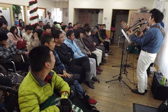 12月23日にジョイジョイワーク引野にてクリスマスコンサートが開かれました。毎年招待させて頂いている東林館高校の喜田理事長率いる「ペットボトラーズ」のデュオがギターを奏でてのコンサートでバラードを中心に数曲。その後はクリスマスにちなんだ「ジングルベル」と「赤鼻のトナカイ」を皆で大合唱してクリスマス気分を味わうことが出来ました。その日の昼食はすき焼きで心も体も腹いっぱいとなり、大満足の一日となったのではないでしょうか。