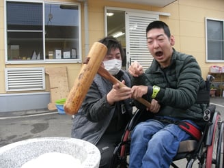 サムエルさんが帰られてからまもなく、利用者さんが到着。具だくさんの特性豚汁、もちは好みでぜんざい、きな粉、大根おろし、納豆からトッピングを選んでもらいました。つきたてのおもちは格別。「おかわり」の声が飛び交い、皆さんお腹いっぱい。こちらもきな粉もちが1番人気でした。天気も良くて大満足の利用者さんたちでした。