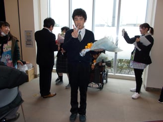 すこやかセンターに移動してビンゴゲーム。「リーチだ!」、「ダブルリーチ!」などいろんな歓声が聞こえる中、かりんの利用者様が一等を獲得!立派なガッツポーズをして、喜んでおられました。最後に新成人となった4人の利用者様に花束贈呈・新成人の抱負を言ってもらいました!正装姿の利用者様方はとても凛々しく素敵でした!