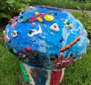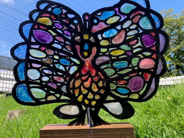 ジョイ・ジョイ・ワーク引野です。生活介護ふらわあとブーケでは、広島県が主催する「あいサポートアート展」に毎年作品を出品おり、今年もふらわあとブーケそれぞれの利用者様が力を合わせて作った作品を出品しました。ふらわあでは、「地球」をテーマに段ボールと紙粘土で土台を作り、みんながそれぞれ好きなものを紙粘土で作って地球に貼り付けました。一番こだわったのは地球を支える「手」です。地球の下側は、みんなの手形を元に紙粘土で作った手で支えられています。ふらわあのみんなで作品を一生懸命作った証がこの手に表れています。ブーケでは、レジンを使用して孔雀を作りました。ベニヤ板をくりぬいてクジャクの美しい羽根をレジンで表現しました。いろいろな色やビーズ、ラメを使い、一人一人の個性が一つに集約した作品が出来上がりました。