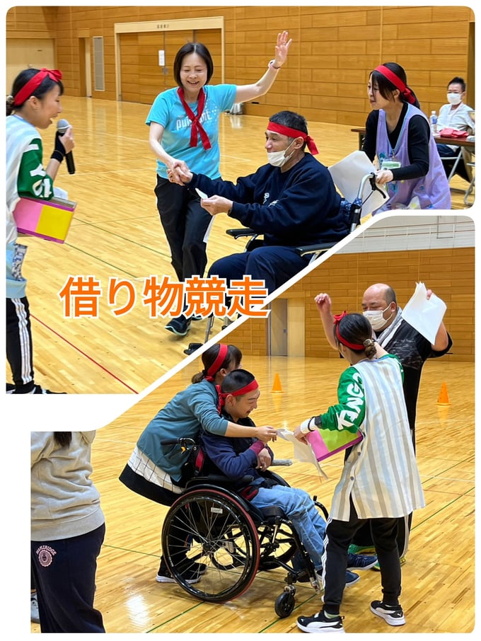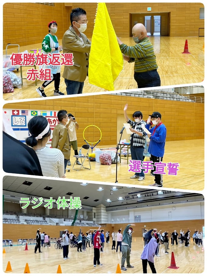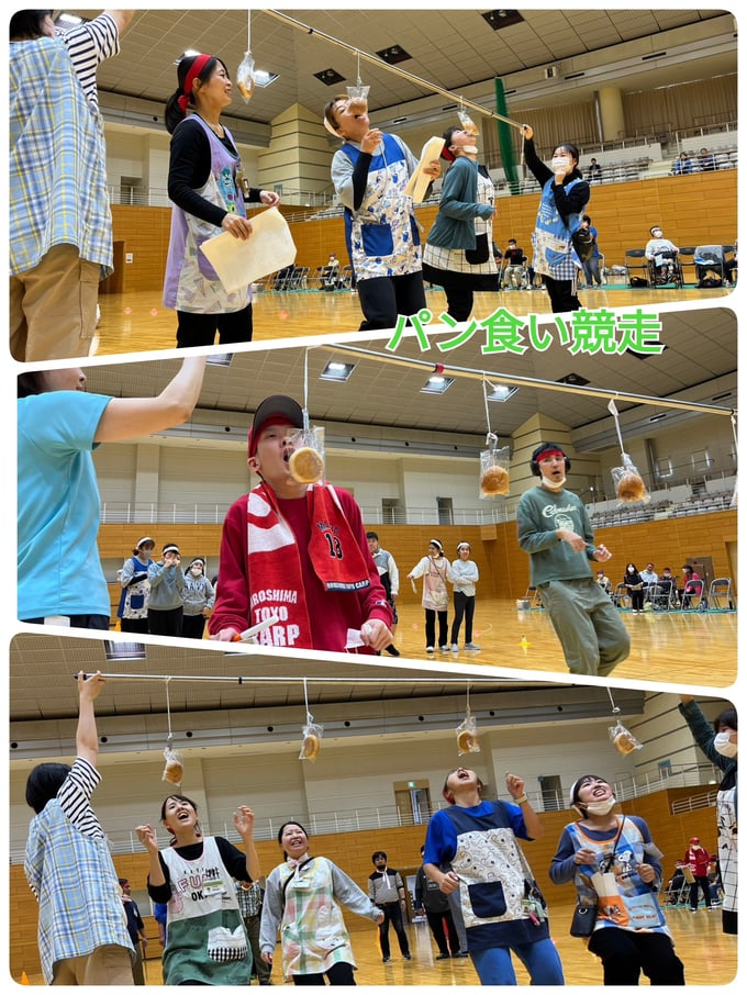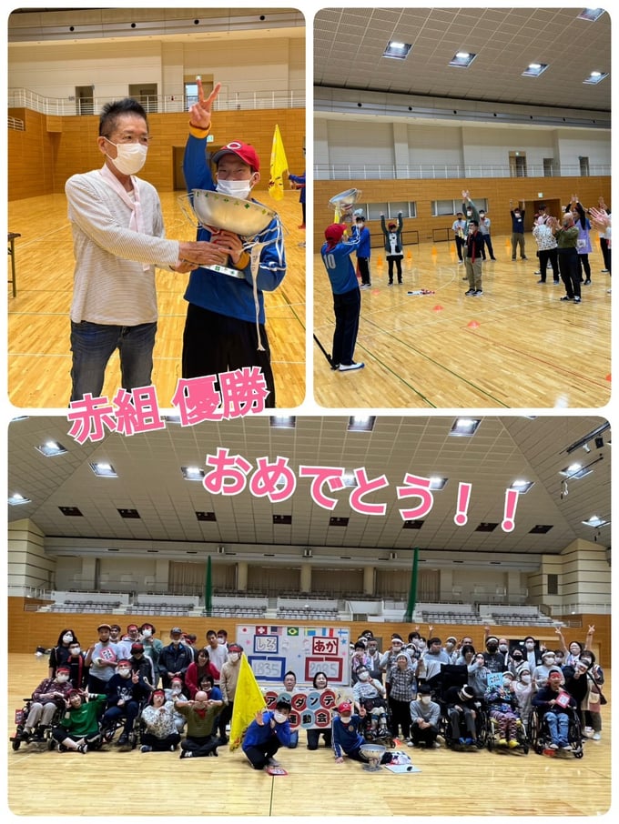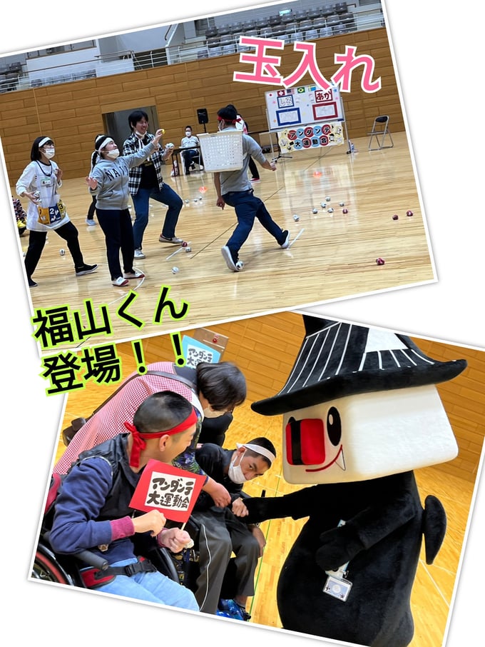 2023年10月14日、笠岡総合体育館をお借りして、引野・めーる・かりんの全事業所が集まりアンダンテ大運動会を行いました。8月の盆踊り大会以来の大きな行事の上、綺麗な体育館で行えるとなってみなさん楽しみにしておられていました。種目は7種目あり、どの種目も利用者さん・職員全力で行いました!①パン食い競争では、豪快にパンに食らいつく方や思いっきり両手を伸ばして取る方とユーモア溢れる種目でした。②玉入れ合戦は全員参加でかごを背負って逃げる職員を追いかけながらどの組も頑張りました。③借り物競争では、簡単なお題から少し難しいお題までさまざまあり、事業所間の交流も深めることができました。途中、選抜された職員によるハーフタイムショーがあり、フレッシュな踊りやかわいい衣装で盛り上げてくれました。福山くんもキックボードで登場し、熱気はさらに上がりました。④ペットボトル運びリレーでは、職員と利用者さんペアとなり、力を合わせて繋いでいきました!⑤狙え!フライングディスクでは、遠くから狙って高得点を目指すのが難しい中、うまく決めて大喜びです。⑥ボール運びリレーでは、全利用者参加しボールを繋いでいく一体感が生まれました。⑦紅白対抗リレーでは、利用者さんたちはいつもよりも真剣な眼差しでバトンを繋ぐ姿がかっこよかったです。真剣勝負の職員リレーも行い、全力を出し切りました。今年の優勝は紅組となりました!みなさんの真剣な顔や全力で楽しむ姿を見ることができ、職員一同も大いに楽しんだ運動会となりました。
