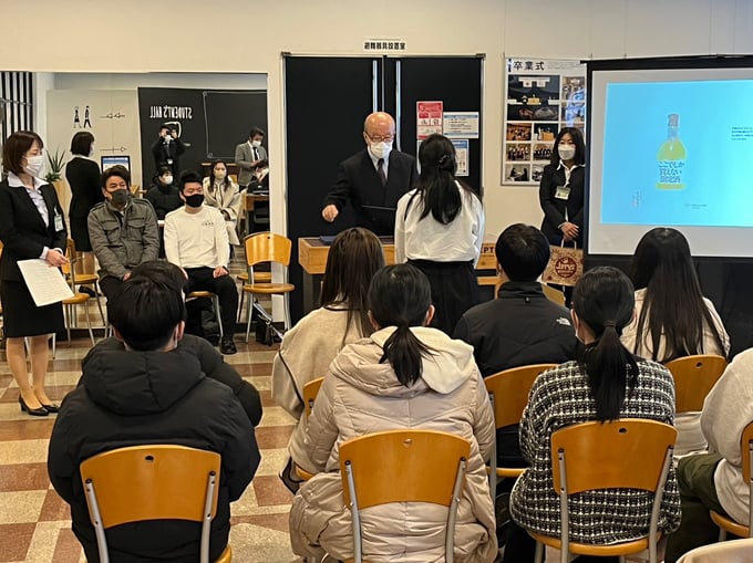 2023年2月15日、福山物産協会様と穴吹ビジネス専門学校CG・WEBデザイン科1年生の産学連携デザイン作品の表彰式が行われました。この物産協会様と穴吹ビジネス専門学校様の産学連携デザインの取組が始まったのは今から4年前です。アンダンテも4年前から都度都度応募していましたがこの度やっと2022年度、焼酎「草戸千軒」のポスターの作成の応募が当選しました。学生さんの授業の一環で行われるとの事で、授業時間にお招き頂き生徒さんに直接【焼酎「草戸千軒」が出来た経緯】【広島県立歴史博物館ミュージアムショップ限定のお土産】【購入者の大半が年配の男性なので、女性にも関心をもってもらえるようなデザインで】【博物館だけでなく何処へ掲示しても通用するようなデザインで】【味に特徴がある】【顧客の目に留まるポスターに仕上げて下さい】と、説明もさせて頂きました。