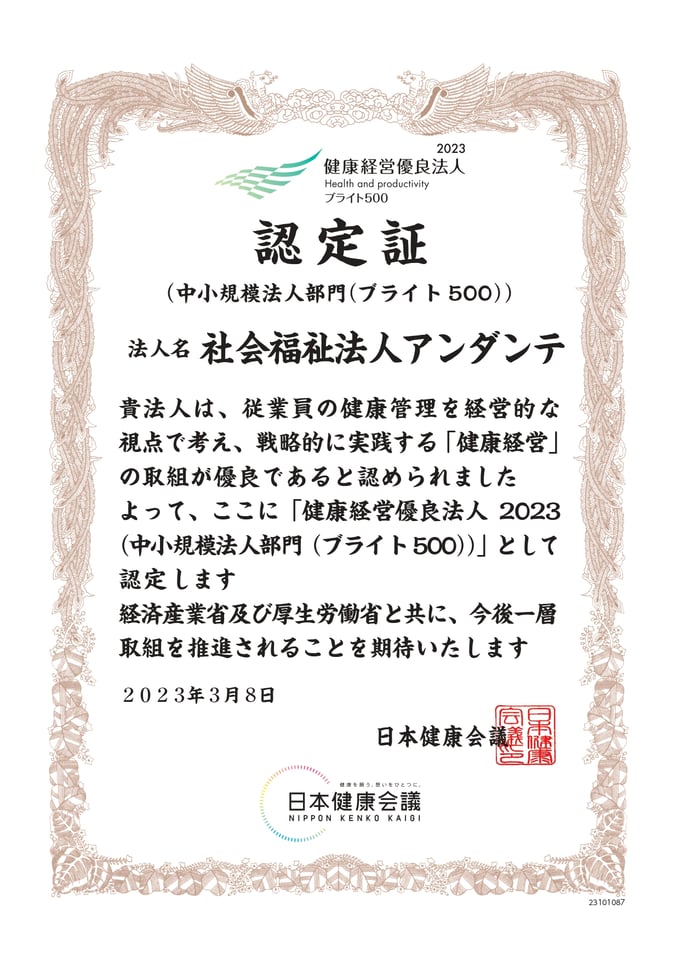 2023年3月8日、アンダンテは健康経営優良法人2023中小企業部門ブライト500に3年連続で認定されました。ブライト500認定が始まる前から通算すると5年連続で健康経営優良法人に認定されています。「健康経営優良2023」の中小企業部門は全国で14,012法人、内ブライト500の冠が付加されたのは500法人でした。その内広島県では393社が健康経営優良法人(内11社がブライト500)、福山市の社会福祉法人ではアンダンテが1社のみ、ブライト500に認定されました。アンダンテは従業員の健康管理を経営的な視点で考え、健康の保持・増進に取組を戦略的に実践する「健康経営」を推進しています。2022年度は男性育休元年とも言われますが、アンダンテはそれよりもずっと以前から男性育休100%、男女共同参画が優れていると認められ、福山市長表彰も頂きました。そしてアンダンテのワークバランスの取組事例の発表の場も沢山頂きました。