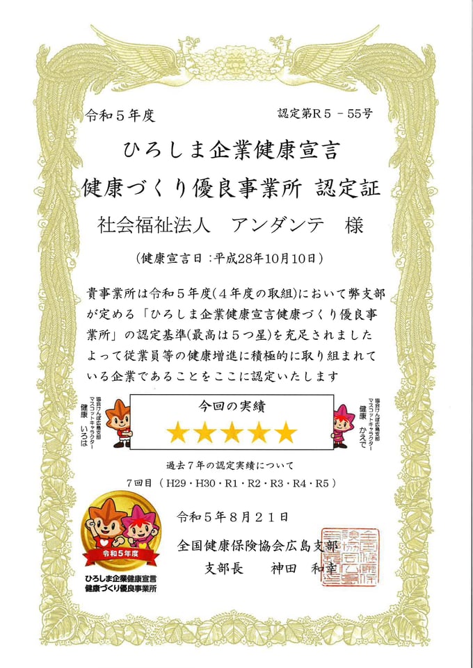 2023年8月21日アンダンテは“ひろしま企業健康宣言健康づくり優良事業所”として認定されました。五つ星認定はこの制度が始まってから連続3回目です。広島県で1,752社の事業所の中で、五つ星認定事業所は661社です。その661社の中にアンダンテは入っています。アンダンテの優良事業所認定ロゴマークは【ゴールド色のもみじちゃんマーク】です。2017.10.10に健康宣言をしてから7年間、職員の健康増進に積極的に取り組んでいます。協会けんぽ様の目標は『健康づくりの好循環』の構築です。アンダンテの最終健康目標は【家庭も仕事もどちらも大好きな職員を増やす事】です。今後も積極的に健康増進を取組ます。