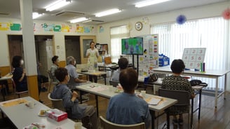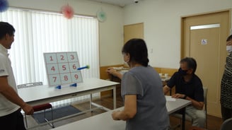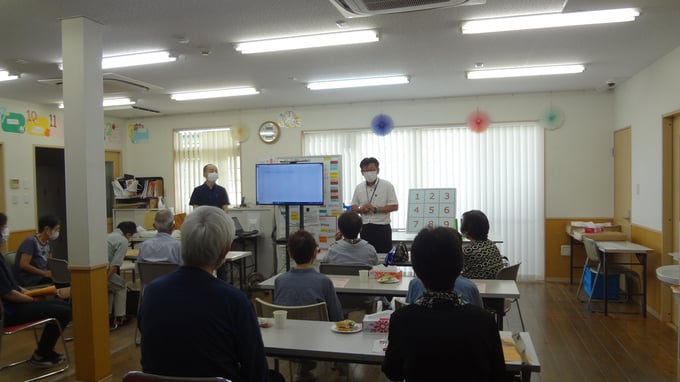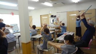 2023年8月12日、旭丘学区ふれあいサロン『まるで井戸端会議』がジョイ・ジョイ・ワーク引野で開催されました。きっかけは、ジョイ・ジョイ・ワーク引野で「地域との交流の場を増やしていける機会がないか」と考えていたところ、偶然旭丘学区で同じようにふれあいの場所を探していることを知り、旭丘学区の福祉を高める会と「一緒に活動ができないか」と話し合いが進み、ジョイ・ジョイ・ワーク引野の場所を提供する事ができました。旭丘学区ふれあいサロン『まるで井戸端会議』では、地域にお住いの70歳以上の方を対象に、ジョイ・ジョイ・ワーク引野で考案した「きよしのズンドコ体操」「福山くん」の紹介や地域の施設の作業療法士による「棒体操」、カラオケ、リクリエーションをして地域との触れ合いの活動を行いました。盛り沢山なプログラムを通して地域の皆さんと触れ合う機会となりました。新型コロナウイルス感染症の影響で、外に出る機会が少なくなっていたこともあり、地域の皆さんも交流の場でしっかりと身体を動かし、リクリエーション等の出し物に一緒に参加され、笑顔で楽しそうに過ごされていました。旭丘学区福祉を高める会の「地域のサロン」は毎月第二土曜日の9時から11時まで開催されます。次回からジョイ・ジョイ・ワーク引野は「きよしのズンドコ節」プラス得意な「ミュージックケア」も提供する予定です。今後も新たな活動の提供を予定しております。楽しんで頂ける内容を考えるだけでワクワクしています。今回の活動の様子はFacebookなどに投稿しているのでぜひチェックしてみてください。