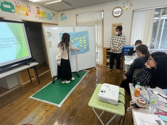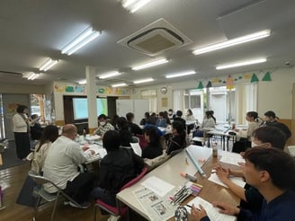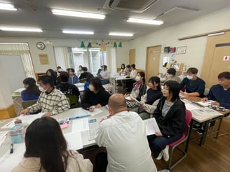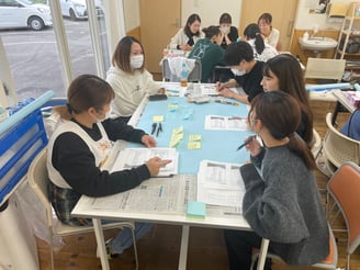 2024年11月16日、施設内研修で福山平成大学健康福祉学部こども学科准教授、矢野川祥典先生をお招きして、「具体的事例から学ぶ支援技法」について学びました。今回は各事業所・部署が混合したグループワーク形式で、事例課題に対する要因や手立てについて、各職員が意見を出し合いました。発表も行うことで、様々な視点や考え方を知ることができ多職種連携の大切さを改めて感じました。先生からの総評では利用者さんに対する背景を聴取、捉えることや、視覚支援や構造化を用いてわかりやすく提示する事などアドバイス頂きました。実際に実践で工夫をしていきながら、一人ひとりに合った伝え方や支援について、より一層の技術・支援向上を目指したいと思います。今回、事例検討会のために情報提供等について快諾して下さった二名の利用者・児童とご家族、たくさんの支援の視点や学びをご教授して下さった矢野川先生に深く感謝申し上げます。