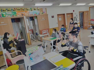テストの審査員(写真左の人)は、実は研修を受講していませんが、利用者さんの思いになりきって判定、助言しています。いろんな活動を提供する中で、自己研鑽や他己評価の大切さも知れるものとなっています。