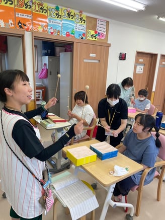 2024年6月、ジョイ・ジョイ・ワーク引野ではさまざまな活動がある中で、毎週ミュージック・ケアを行っています。ミュージック・ケアとは、日本ミュージック・ケア協会が行っている集団音楽療法を基本にしたもので、心身の発達に必要な情緒の安定や身体的機能の維持改善、発話などの為の刺激や動作に応じて音楽を用いる活動です(宮本啓子氏著より抜粋)。