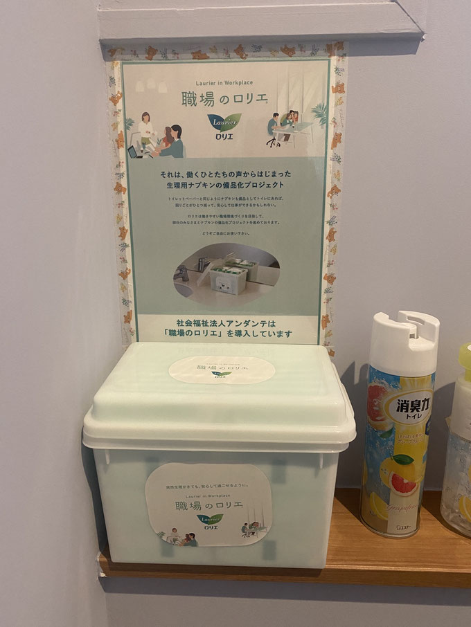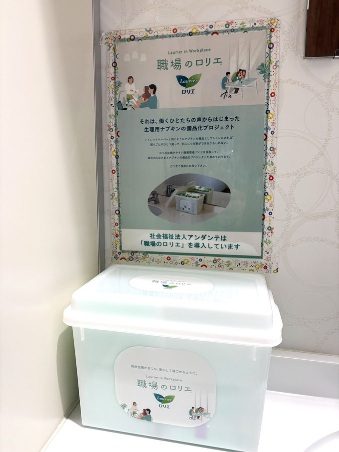 2025年11月より、アンダンテの全事業所で「職場のロリエ」の取組みを始めました。「職場のロリエ」とは、花王株式会社の生理用ナプキンの備品化プロジェクトです。女性職員の声に応え、このプロジェクトに参加しました。女性にとって大きな悩みになることも多い生理ですが、もしもの時にも安心して仕事ができるようになりました。今後も職員が働きやすい職場環境であり続けるため、様々な取り組みを行って参ります。